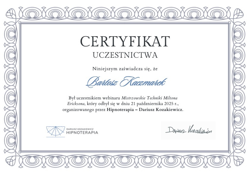 Nieustanny rozwój to fundament mojej pracy. Każdego roku inwestuję czas i energię w liczne szkolenia oraz kursy certyfikowane, aby być na bieżąco z najnowszymi trendami, metodami i narzędziami w mojej dziedzinie. Dzięki temu mogę oferować rozwiązania, które wyróżniają się skutecznością i jakością, a moi klienci zyskują pewność, że korzystają ze wsparcia specjalisty stale podnoszącego swoje kompetencje. Certyfikaty, które tu prezentuję, to nie tylko dokumenty – to dowód mojego zaangażowania, profesjonalizmu i dążenia do tego, aby zawsze zapewniać usługi na najwyższym poziomie.